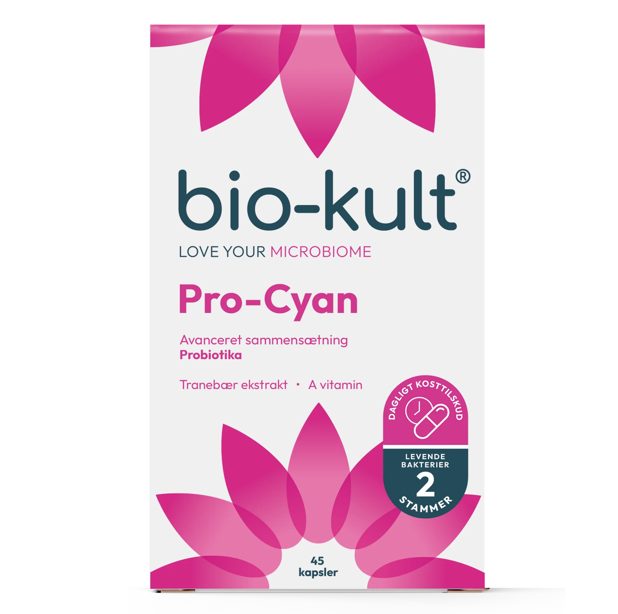 Bio-Kult Pro-Cyan er målrettet urinvejene, og er en unik sammensætning af 2 stammer af levende bakterier, tranebær ekstrakt og A vitamin.